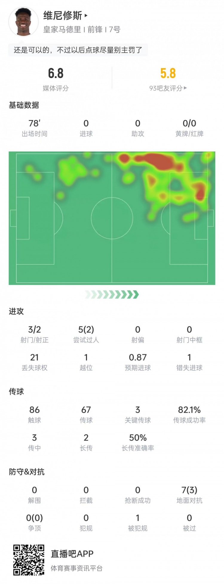 2025-11-02 08:04:53维尼修斯本场数据:丢点+21次丢失球权,3次关键传球,获评6.8分